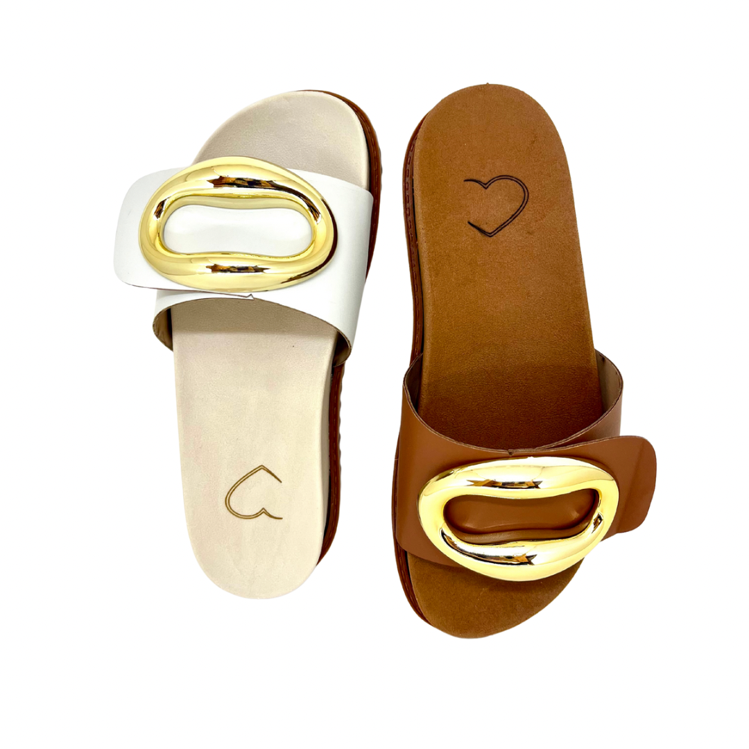 Cabedal com tira grosso em couro tecnólogico e fivela quadrada dourada.