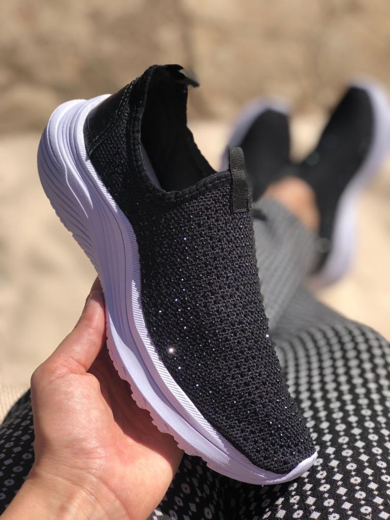 Fechamento em formato meia com elástico, facilitando o calce, solado flexível, emborrachado com frisos antiderrapante.